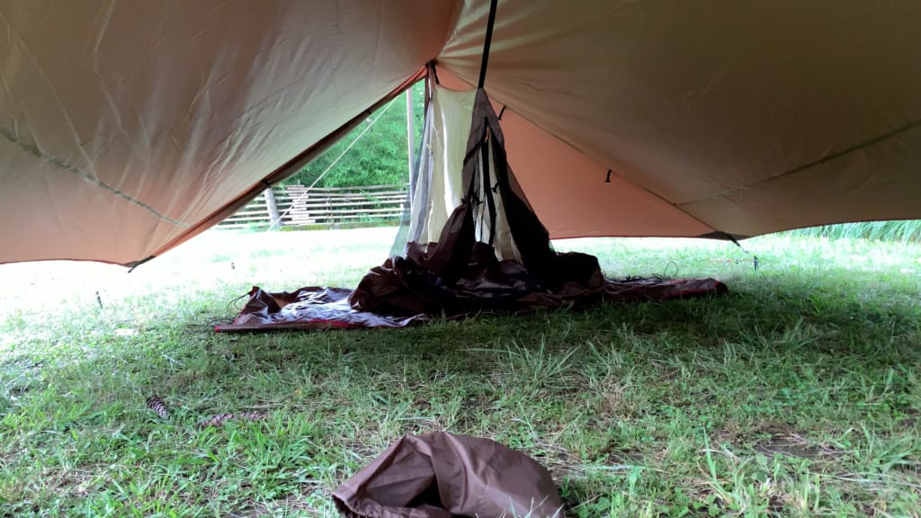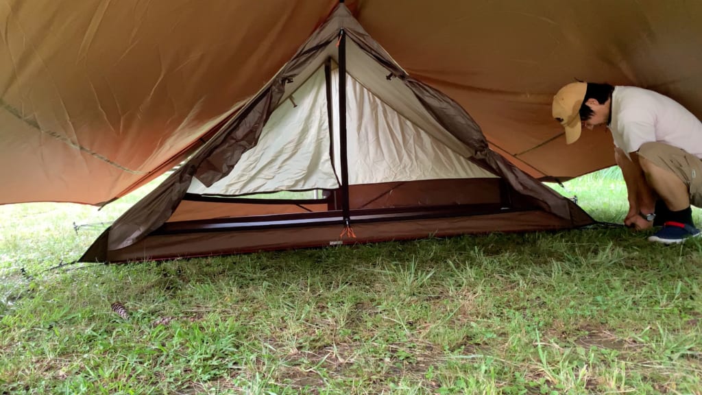 ヘキサエヴォPro.は 6x5m ほどの広大なエリアを確保できるので、その下にヘキサイーズ1を入れることで雨に濡れることなく快適に過ごすことができます。