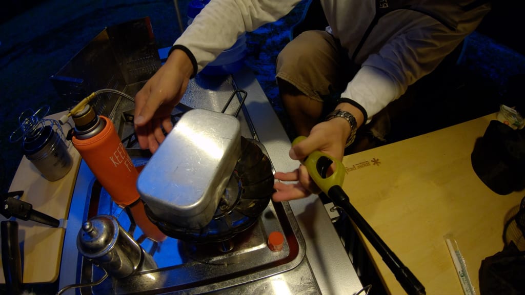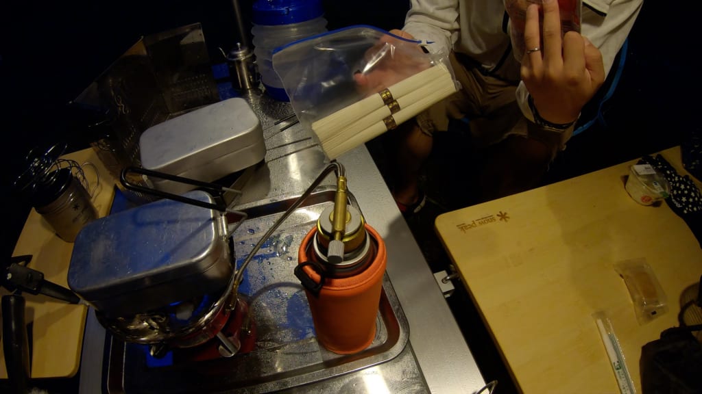メスティンで炊飯し、蒸らしの間にメスティンラージで揖保乃糸を煮ていきます。