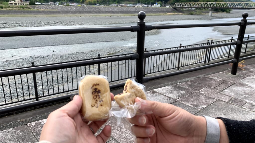 富士川沿いに椅子があるので、富士川を眺めながら身延饅頭をいただきます。