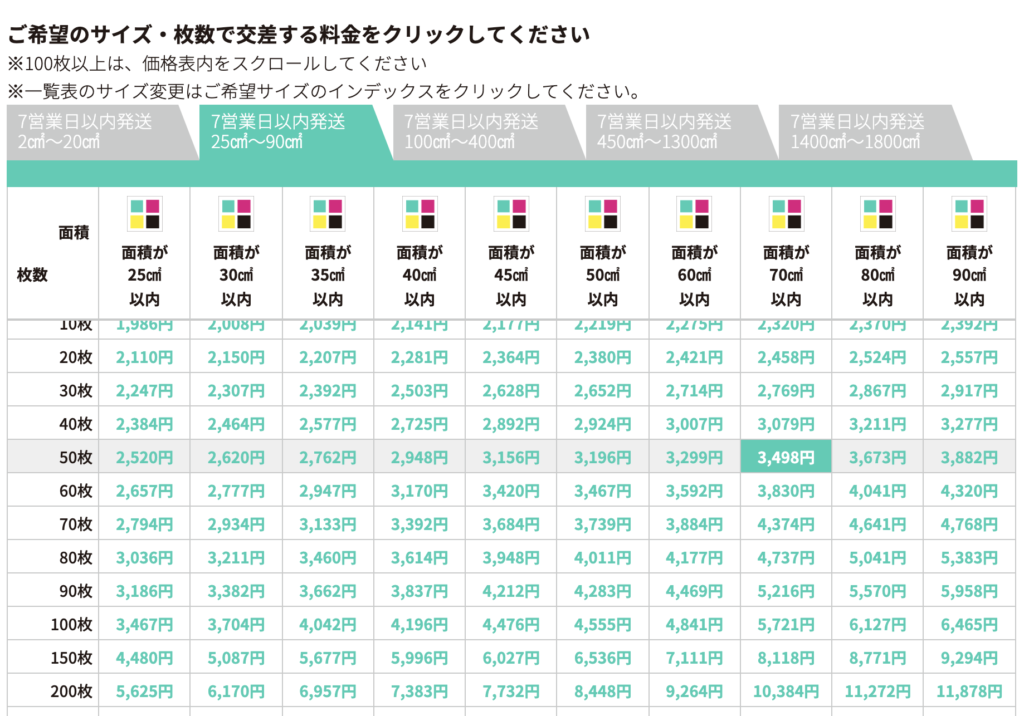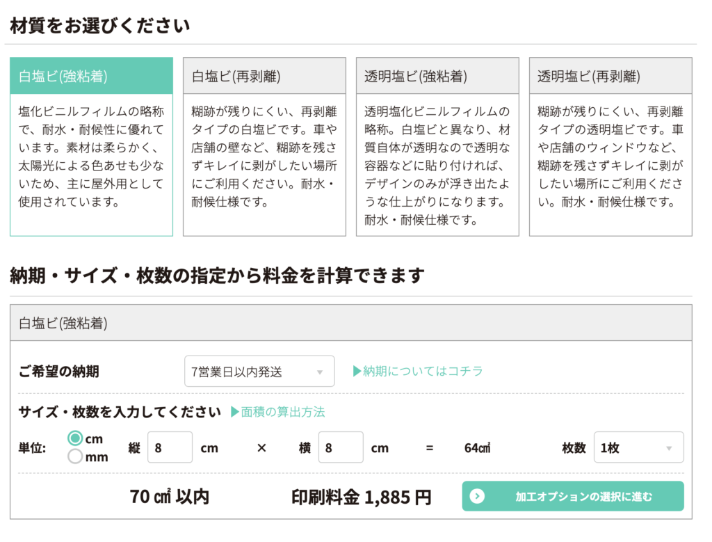 材質、納期、サイズを決めると価格表が自動で表示されます。