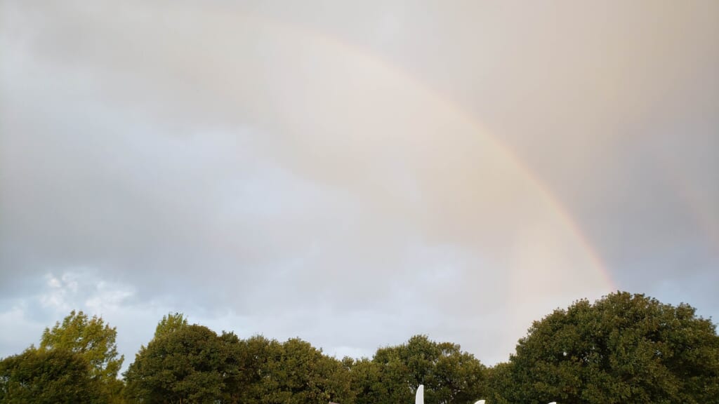 朝日を拝みつつ、反対側には虹が出ていて、気持ちの良い朝を迎えられています。